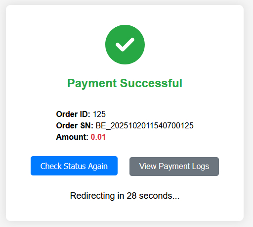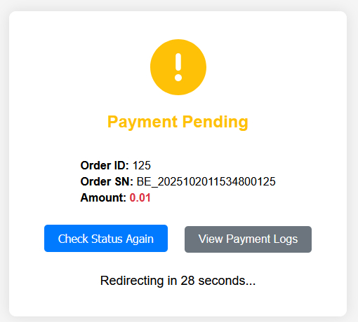插件支持Sandbox模式,采用多种验证模式来确保回传信息的正确,为防止用户体验感不好,特别加入了等待支付完成的页面,用户在支付成功后返回此页面,并可以手动刷新来获取最新的订单status状态信息。以确保webhook在用户支付成功后,大约30秒-1分钟之类响应这段时间给用户带来的体验差的情况。